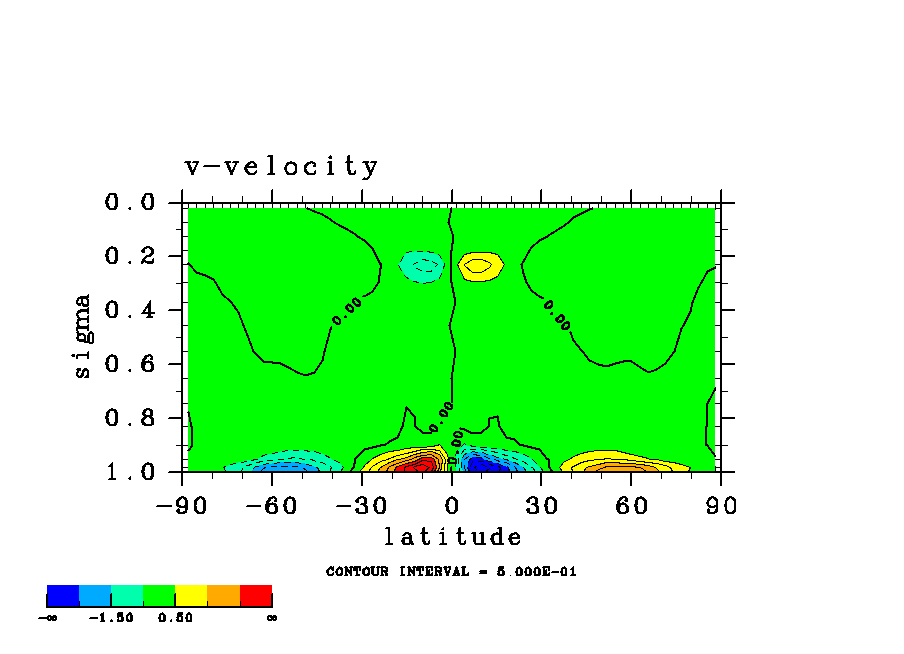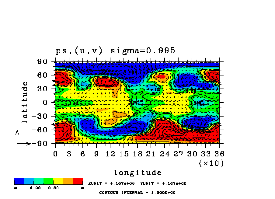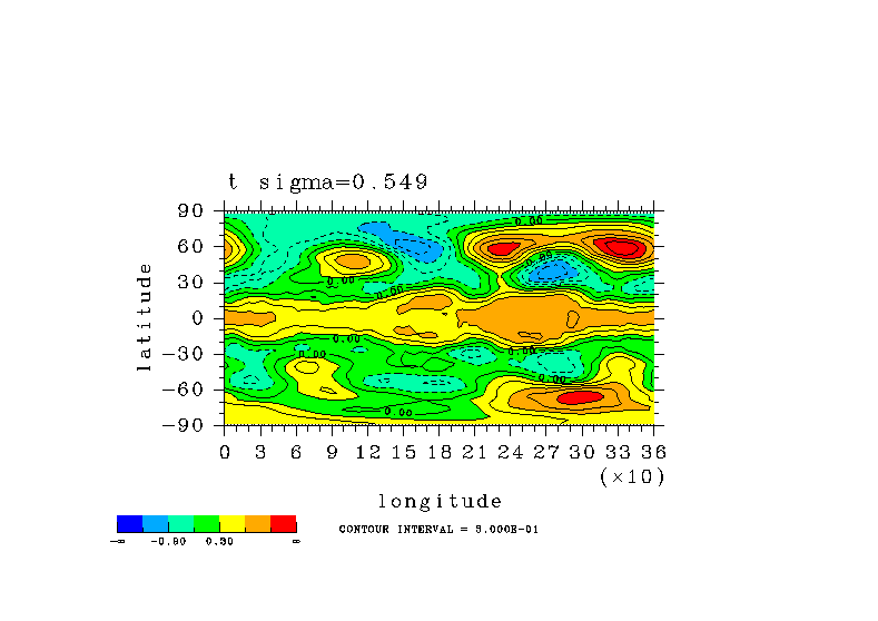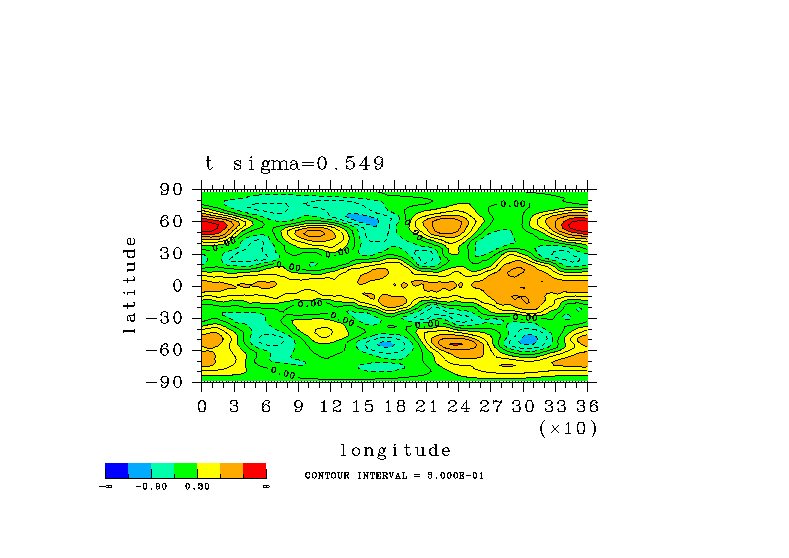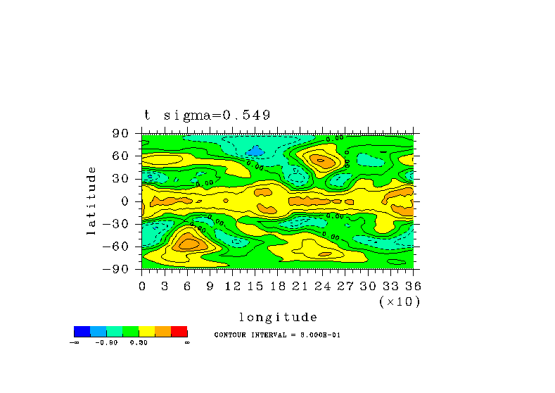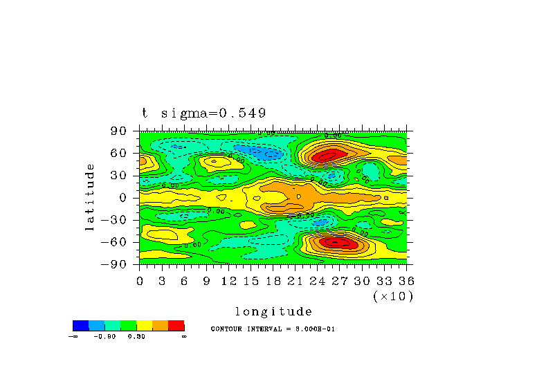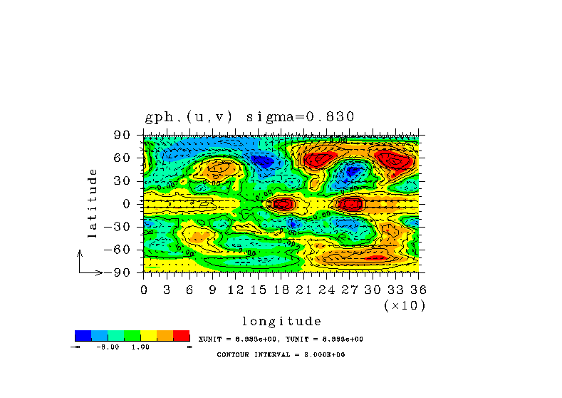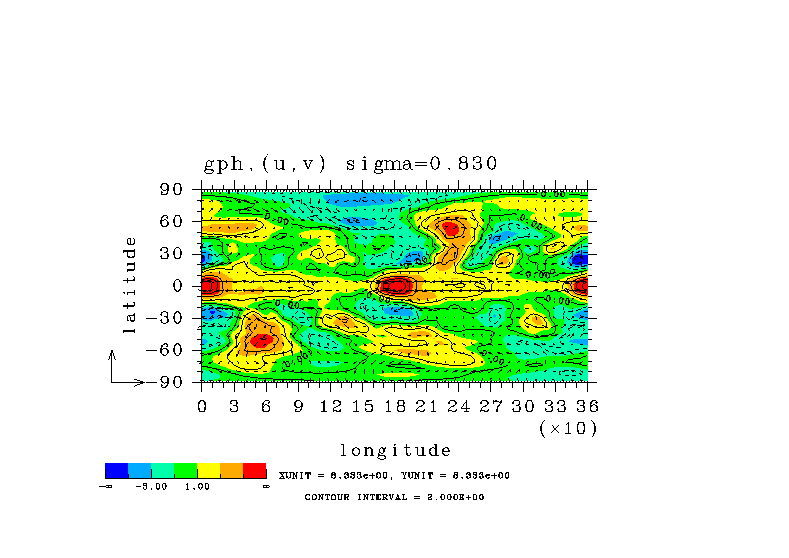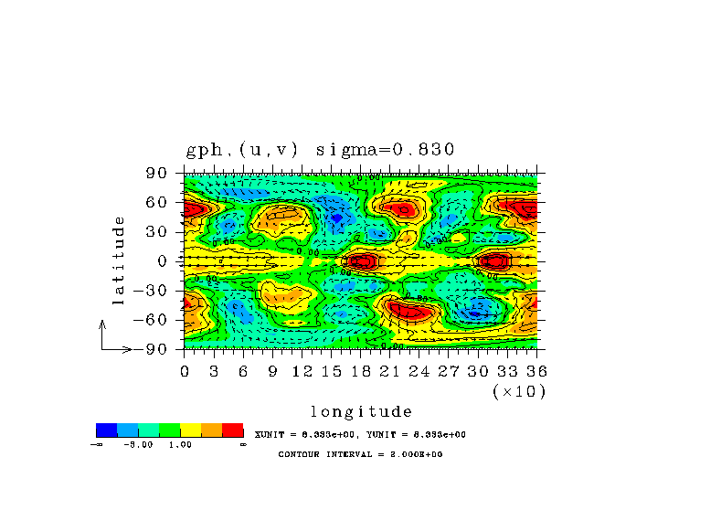 温度 + (u, -SigDot) の (x,z) 断面 at 赤道