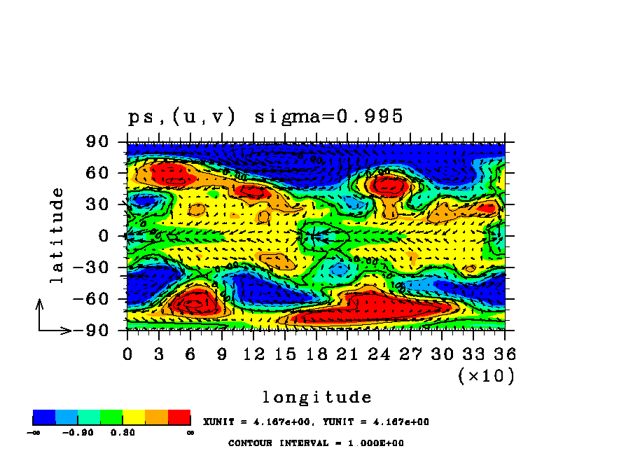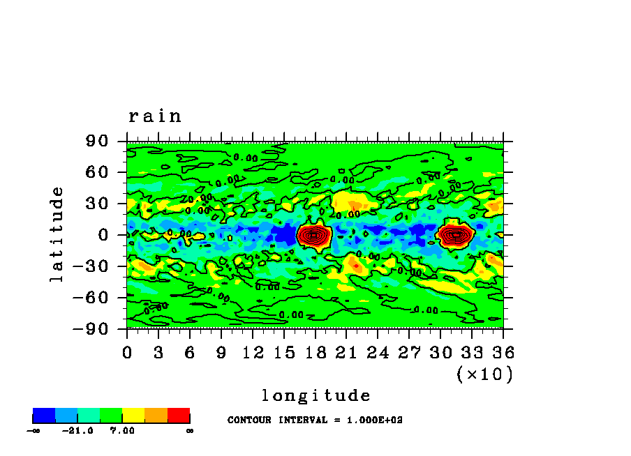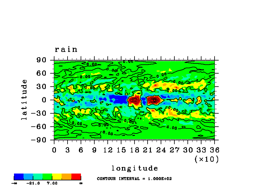 | 表面気圧の (x,y)水平分布図. | 降水の(x,y)水平分布図. (rain 瞬間値) |