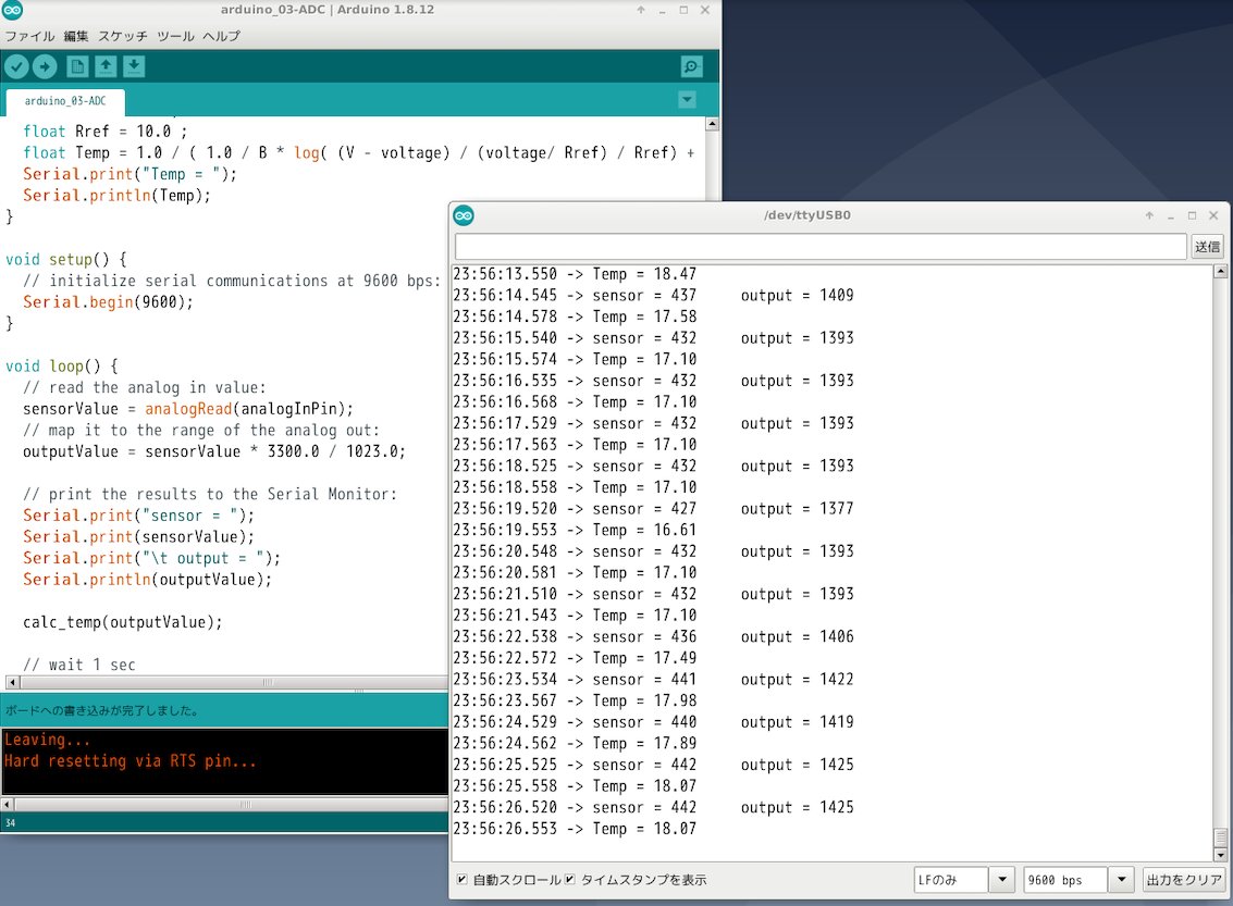 - 7 ~ 15 行目, 34 行目に温度計算と表示を追加されている. 基板の定格電圧は 3.3V なので, V = 3300 にしている.