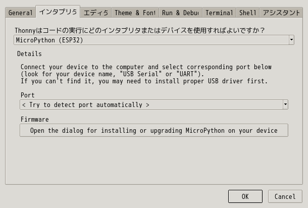 Thonny の「ツール」メニューから、「Options」を選択して、「インタプリタ」タブを選択する。 まずは以下の設定を行う。