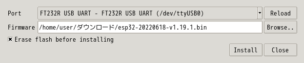 <URL:https://micropython.org> の「Download」より, MicroPython のファームウェアをダウンロードし, それを ESP32 内蔵のフラッシュメモリに書き込む必要がある. 今回は ESP32 用の esp32-20220618-v1.19.1.bin を取得した.