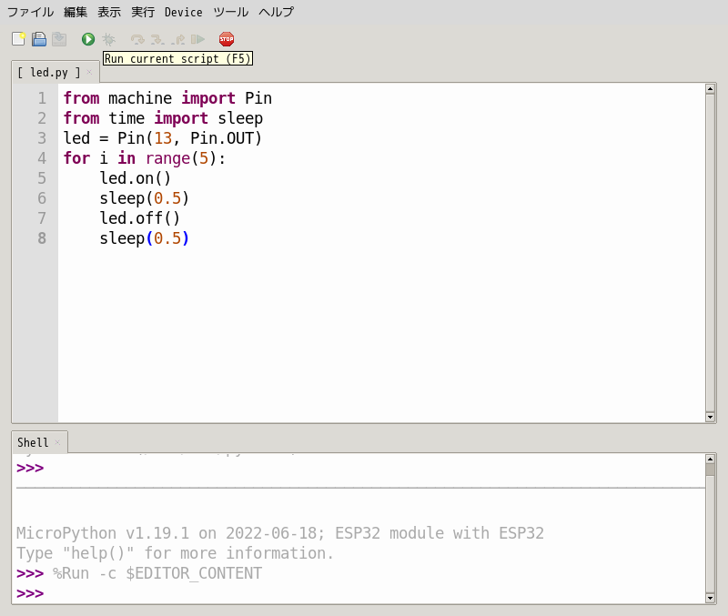 L チカをする. LED の 1 番目は GPIO 13 なので, それを 5 回点灯させる. 以下のコードを書き込む