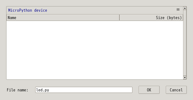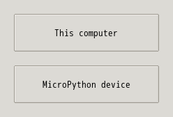 次に、「再生ボタン (Run current script (F5))」をクリックする。 ウィンドウ(Where to save to?) が開くので, 「Micropython device」を選択する。 保存するファイル名は適当で良い。