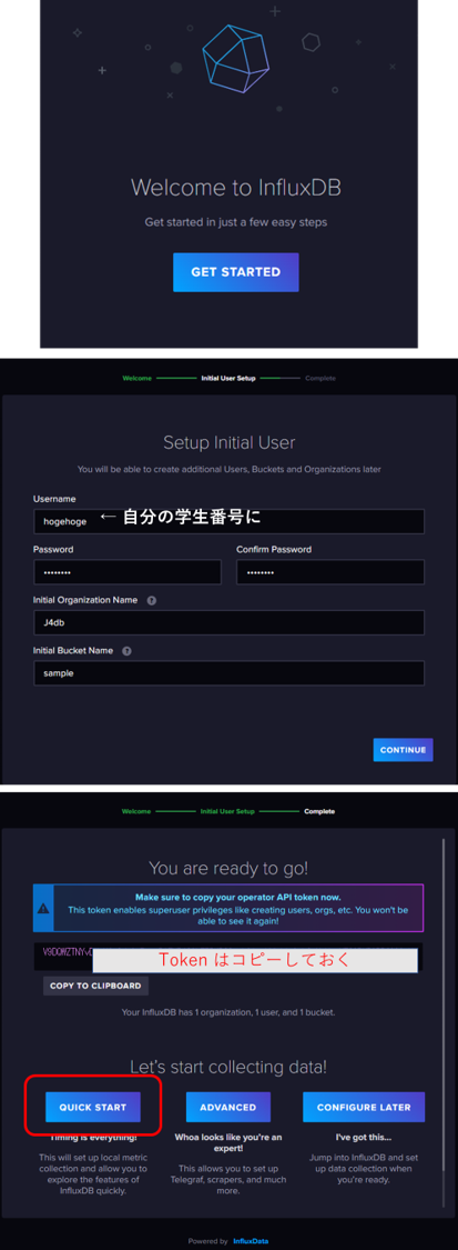 Web ブラウザ上でセットアップしてみる.http://10.176.0.1XX:8086 にアクセスすること (XX は自分の VM に合わせて設定すること).但し,表示された Token は必ずコピーしておくこと.