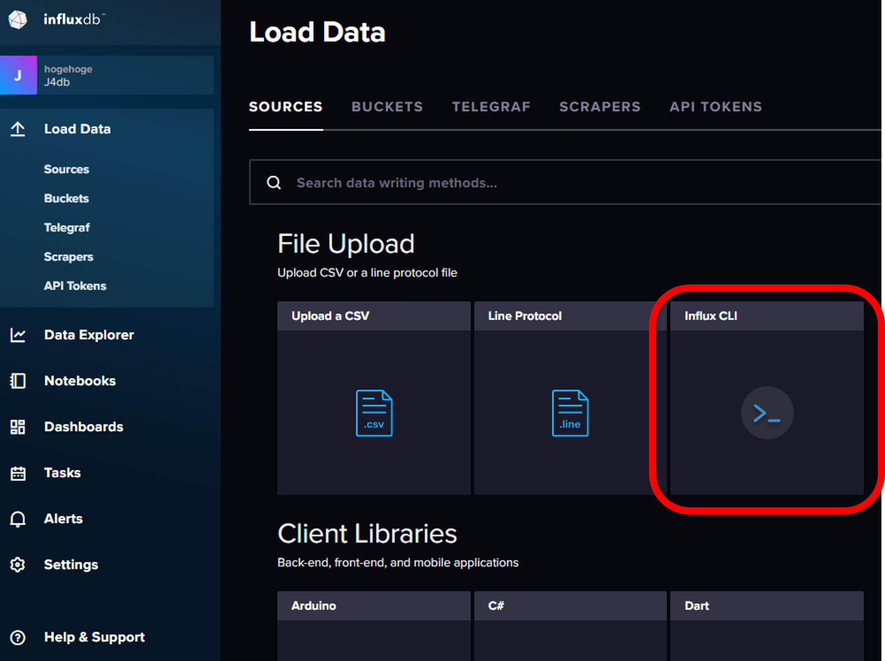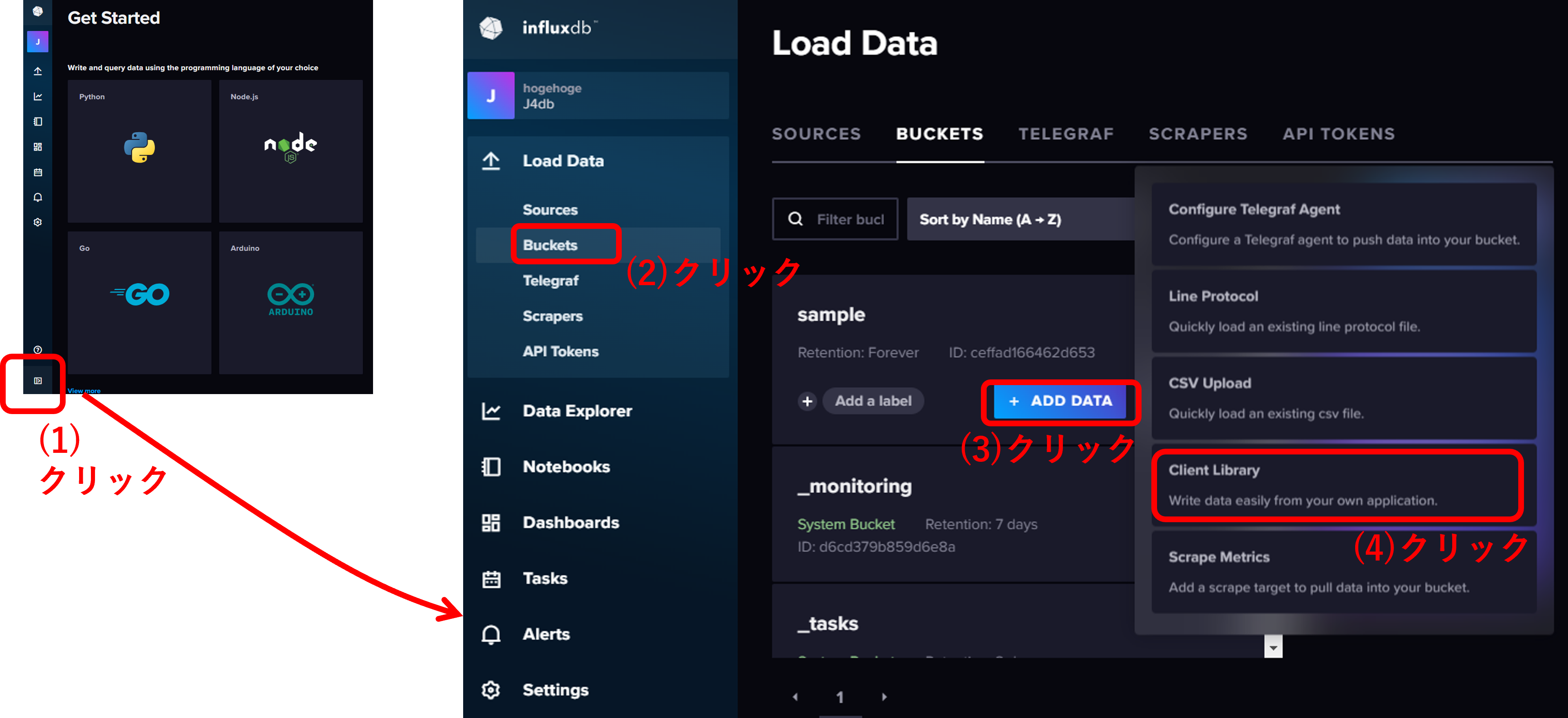 次に作成した Organization : J4db と bucket : sample にサンプルデータを投入する. 下図のように選択していき,