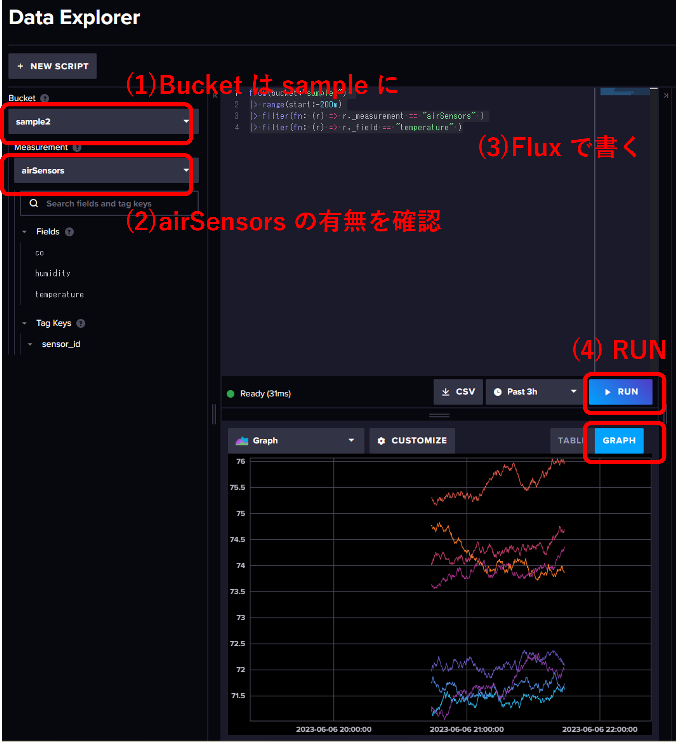 左カラムで "Data Explore" を選択し,Bucket : sample の中の Measurement に airSensors (サンプルファイルで入力したもの) があるか確認する.あれば, 以下の図のようにデータを書いてみる.