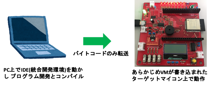 MicroPython でプログラミングする場合は, 以下の図のような処理の流れになる. このような処理を行う上での大前提は, あらかじめマイコン上に 仮想マシン (VM) をインストールすることである.