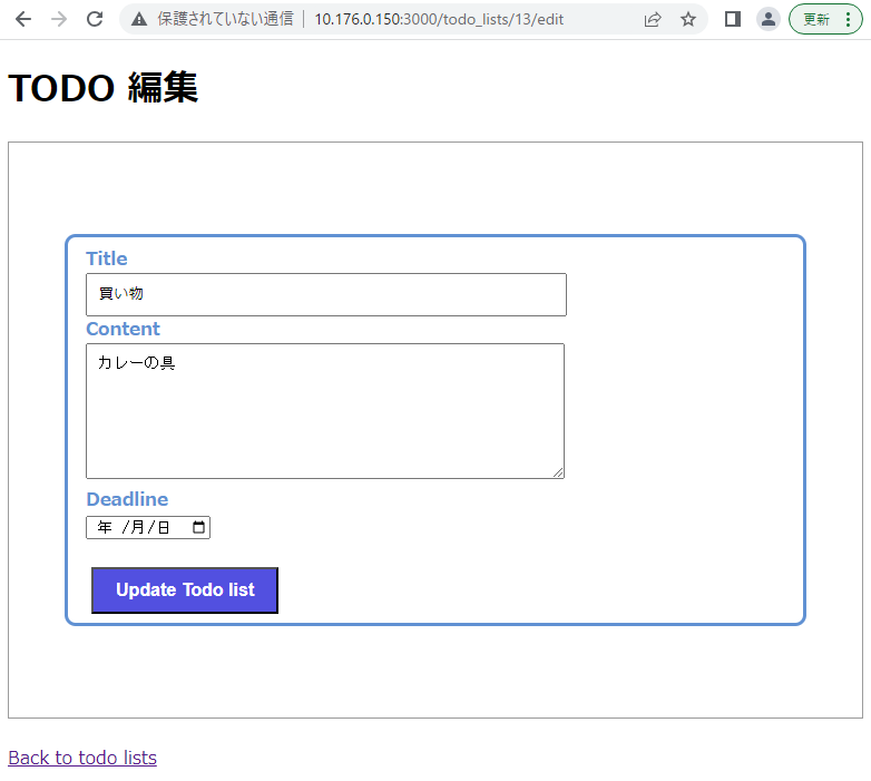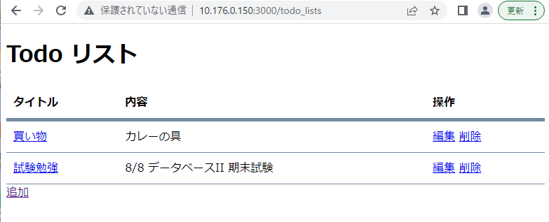データベースの todo_lists テーブルにカラムを追加する必要がある. 追加の仕方は,データベースを使ったアプリ作成 2 を参照すること.