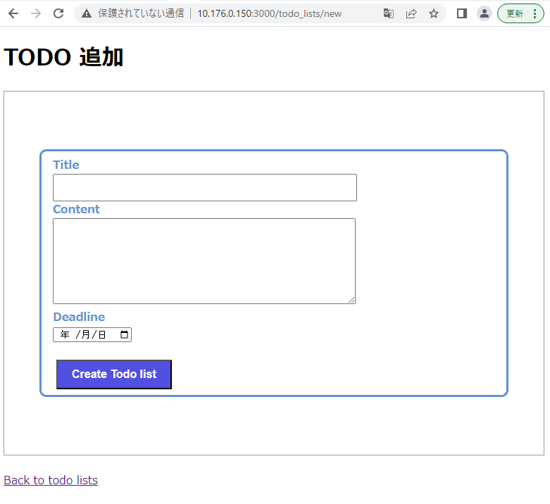 scaffold でアプリを作成する.コントローラの名前は todo_list にする. テーブルには title (string 型), content (text 型) の 2 つのカラムを作成する.