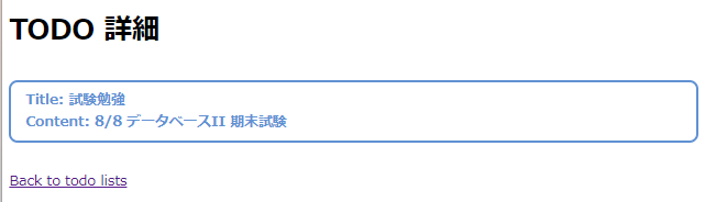 アプリ (/todo_lists/) の見た目を以下のように変更し,全てのページが動作するようにしなさい.ビュー・コントローラ・ルーティングのファイル,CSS ファイル,およびページのスクリーンショット (4 枚,含む URL バー) を提出すること.