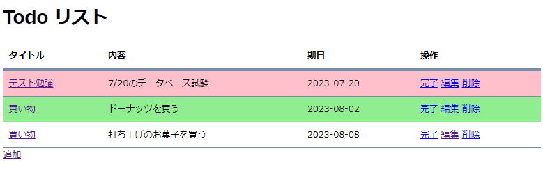 - 操作のところに「完了」のリンクを追加する.それをクリックすると,データベースの completed カラムに 1 ないし true が入力され,「インデックスページ」にリダイレクトされること.