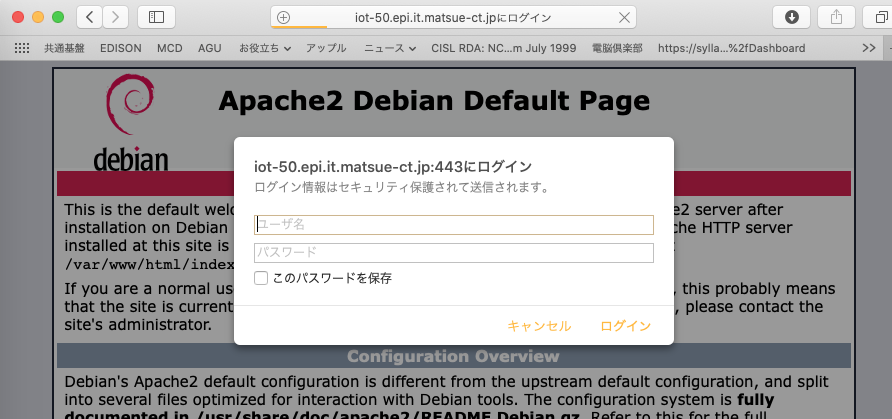 ブラウザから https://iot-XX.matsue-ct.ac.jp/~hogehoge (XX は自分の番号, hogehoge は自分のユーザ名) にアクセスしてみて, 認証がうまくいくか確認すること.