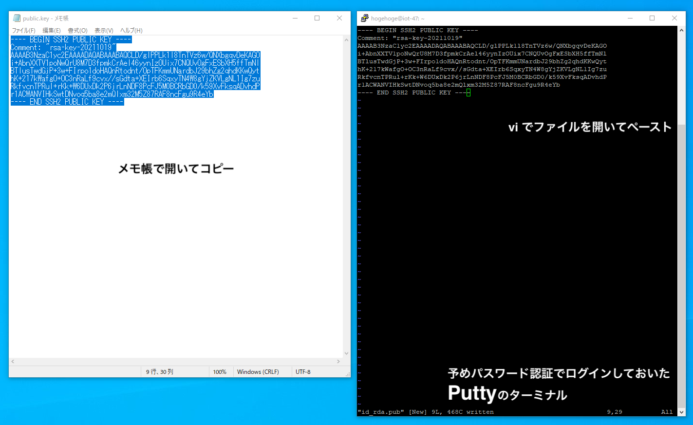 次に,ログイン済みの putty のターミナル上で vi で id_rsa.pub というファイルを開き, 自分の公開鍵の内容をコピーする.