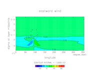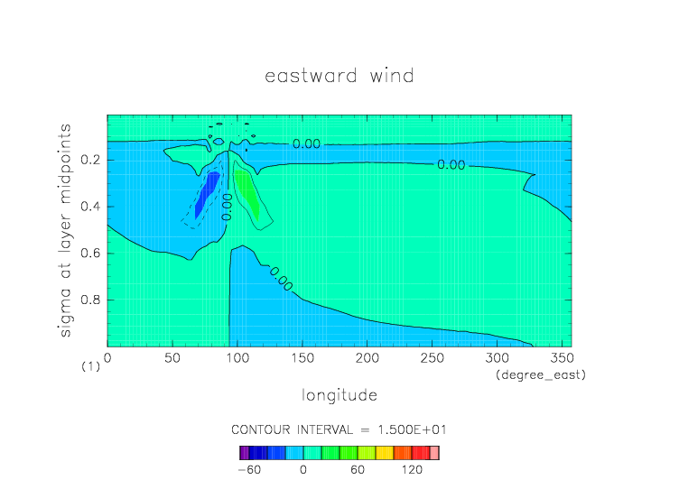 東西風. 赤道断面 (鉛直座標は対数プロット) |