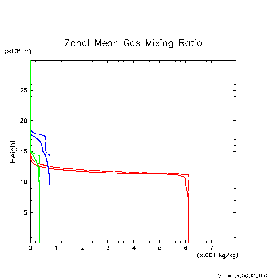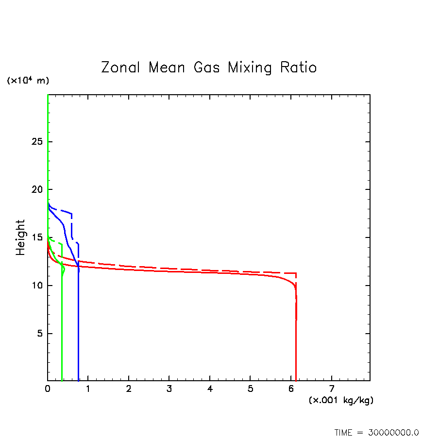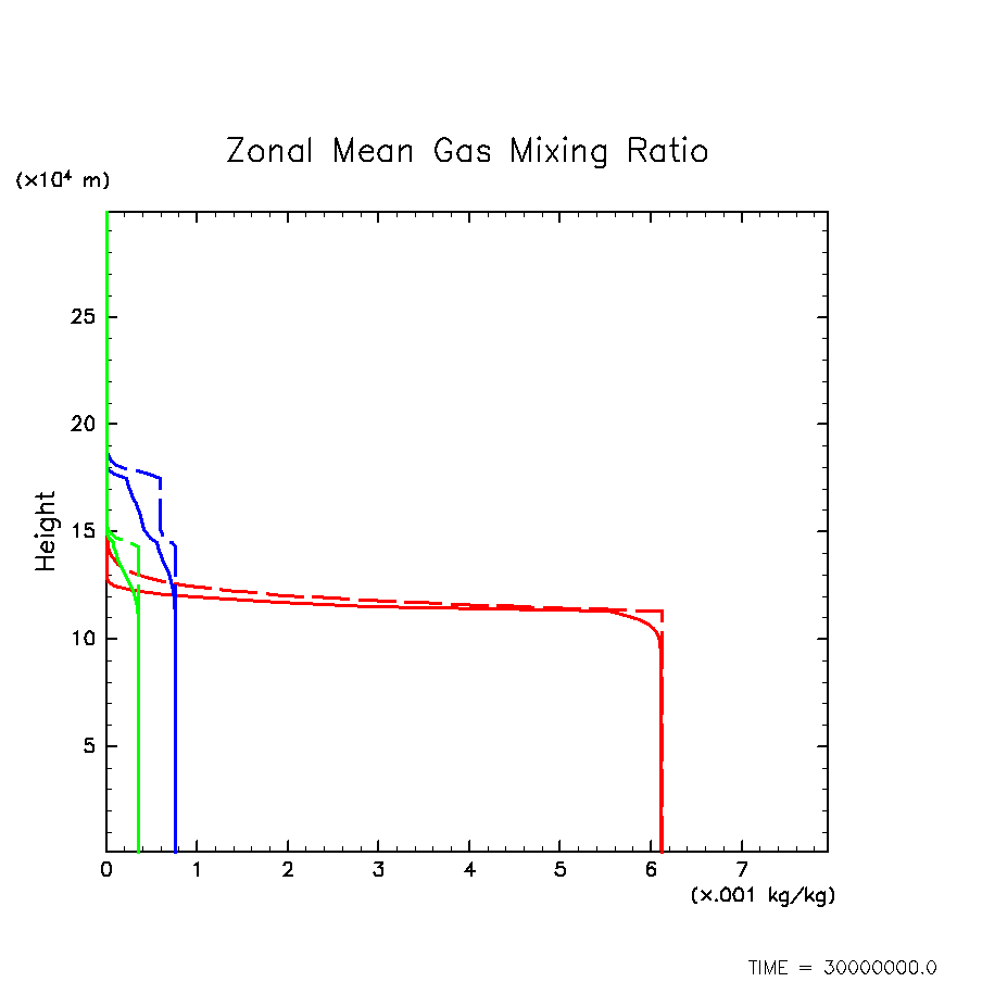 凝結成分気体混合比の水平・時間平均(赤: H2O, 緑: H2S, 青: NH3)
