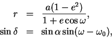 と表される. ここで は近日点からの太陽の角度位置, は軌道長半径, は軌道離心率, は自転軸の傾き,